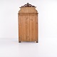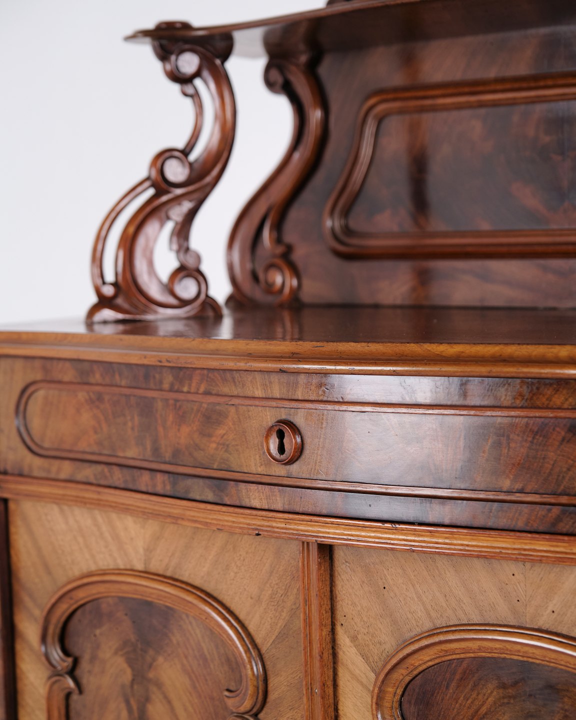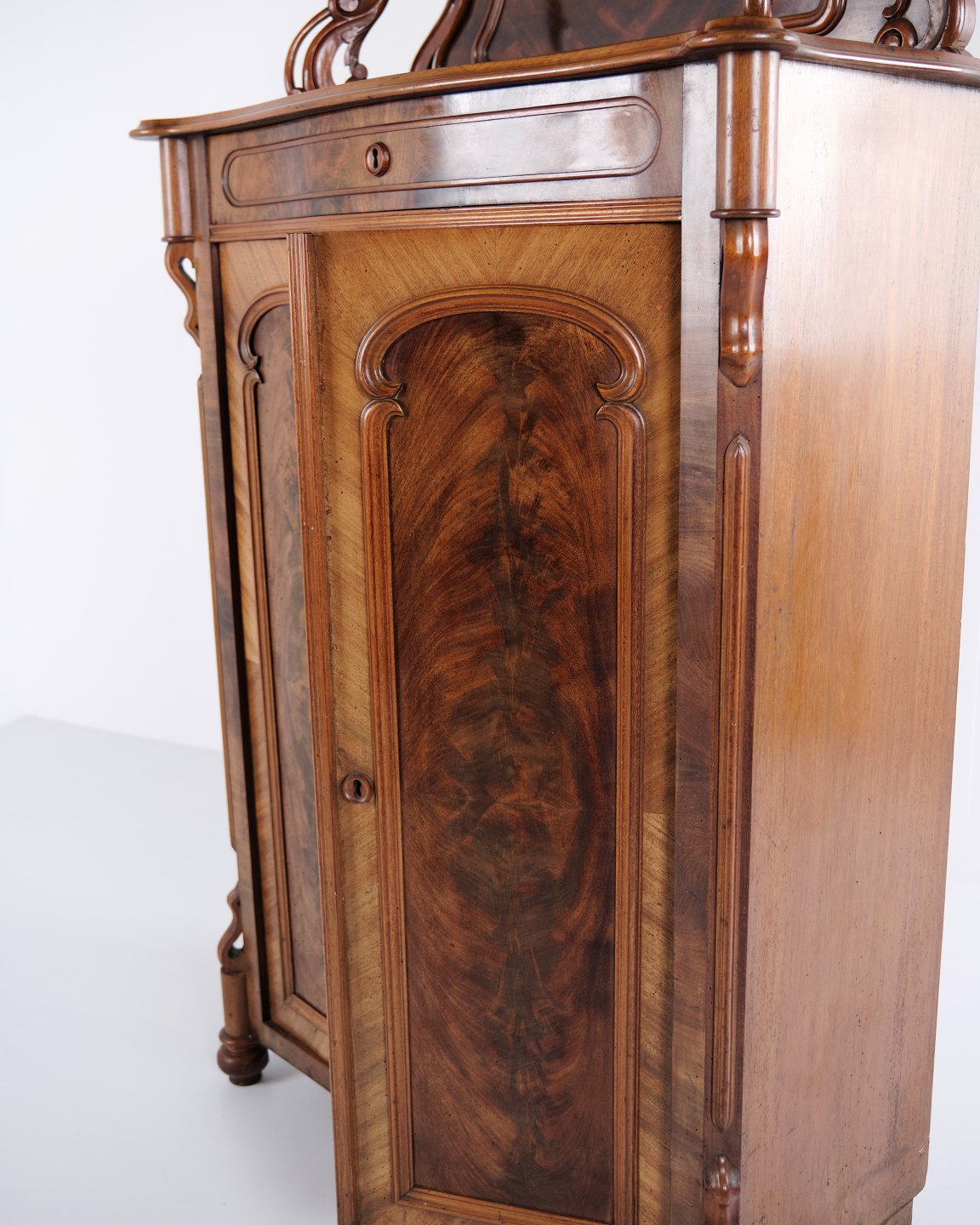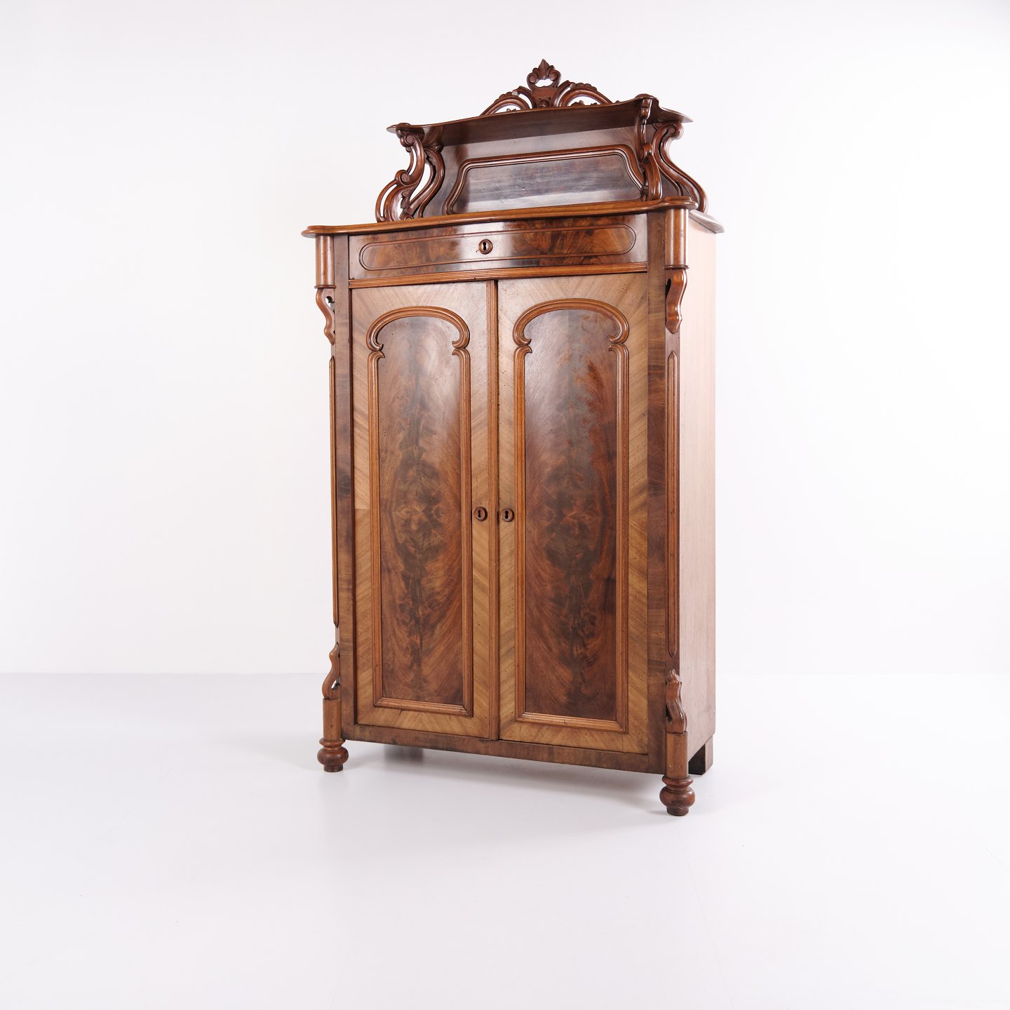 Antique mahogany cabinet from the 1880s with decorative carvings. Features doors and interior shelves, suitable for storage in living rooms, hallways or dining areas.