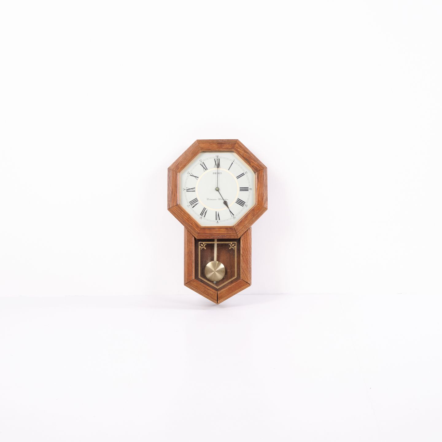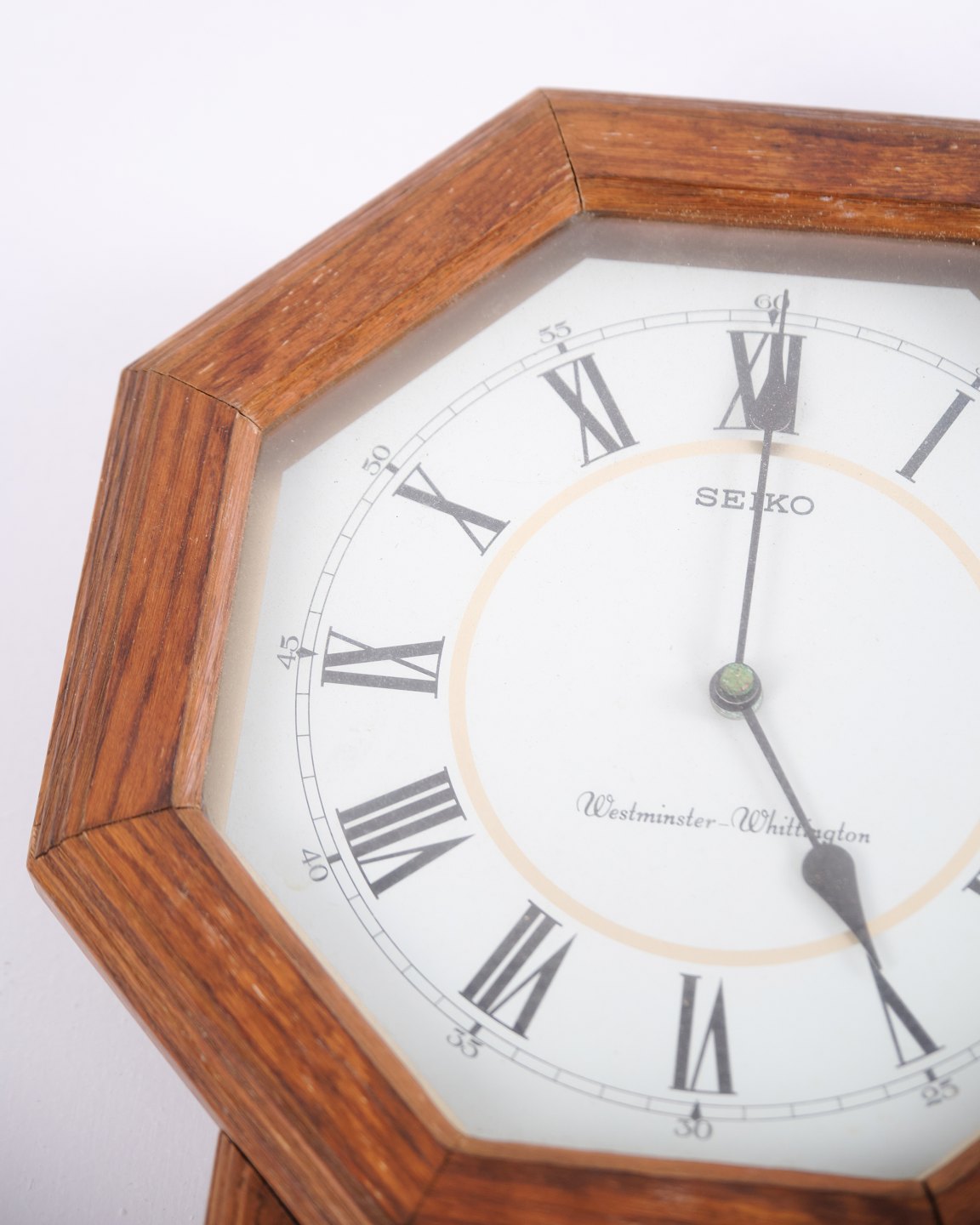 Wall clock by Seiko featuring Westminster and Whittington chime melodies. Crafted in oak with a classic front and clear dial. A quality clock with precise movement and a timeless appearance.