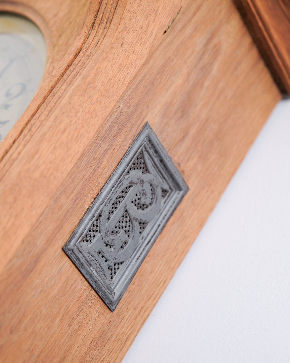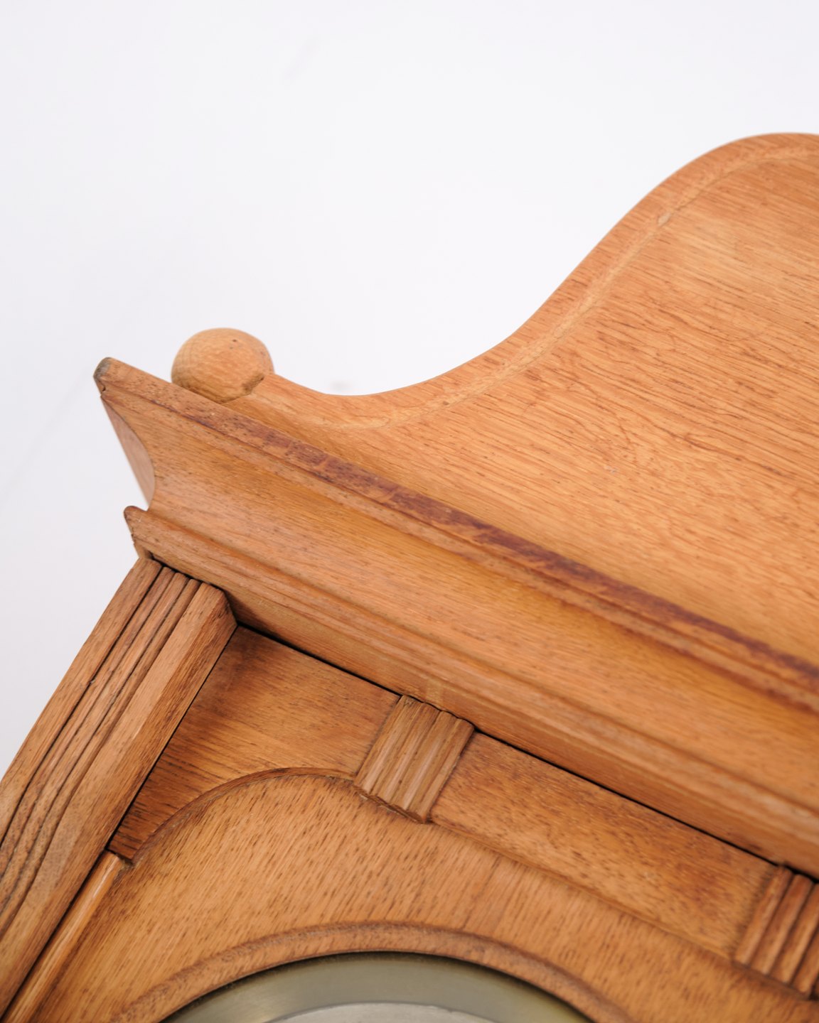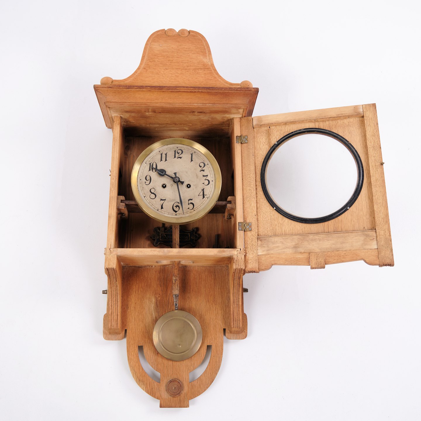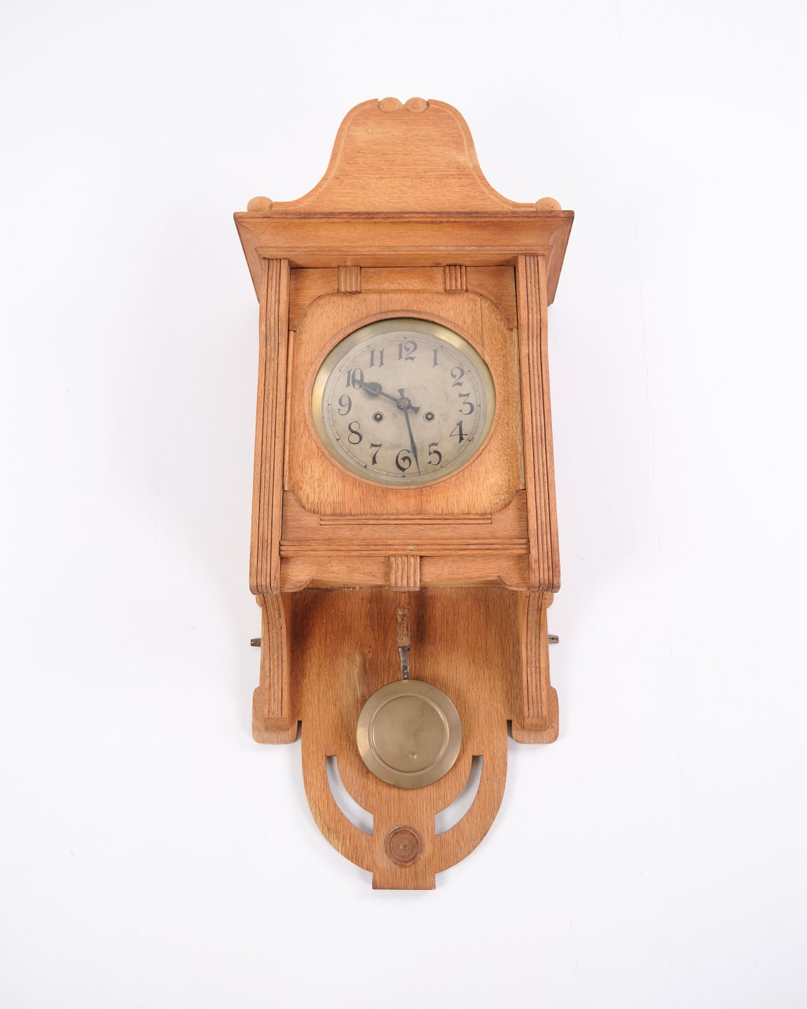 Wall clock from the early 1930s, crafted in oak and designed in the characteristic organic style of Art Nouveau. The case features elegant detailing and a classic front that reflects the craftsmanship of the period.