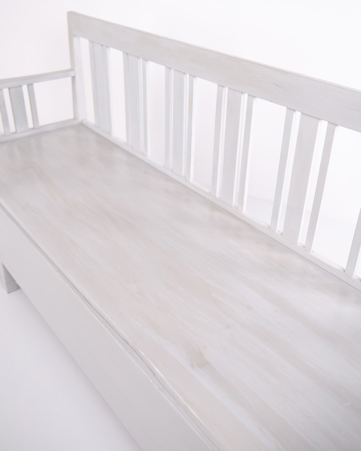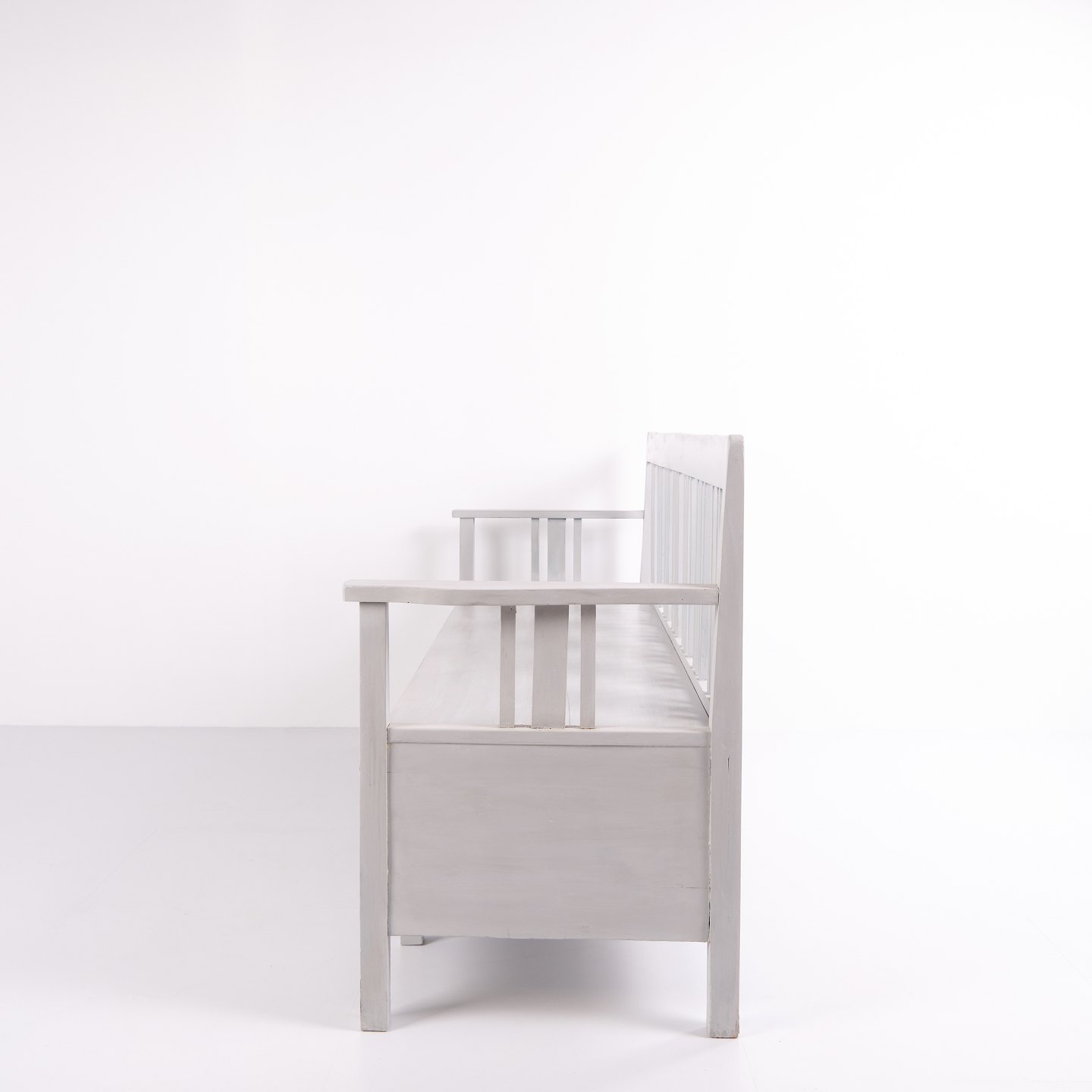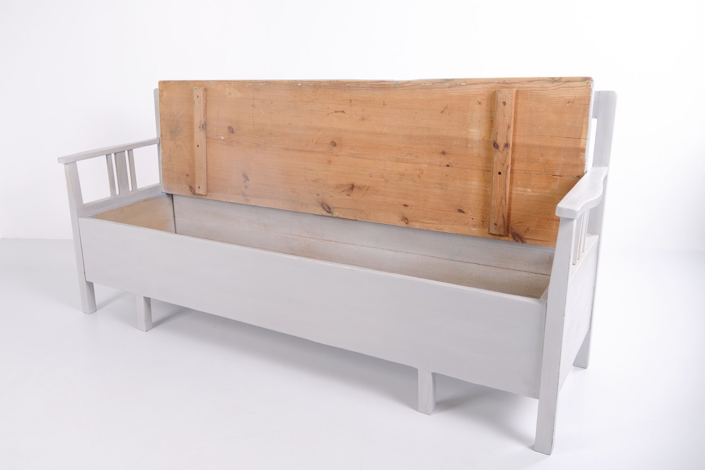 Swedish bench from the 1860s, made in pine and later painted in grey. A classic Scandinavian piece with decorative painted details and practical seating and storage function. Solid antique furniture with characteristic period features.