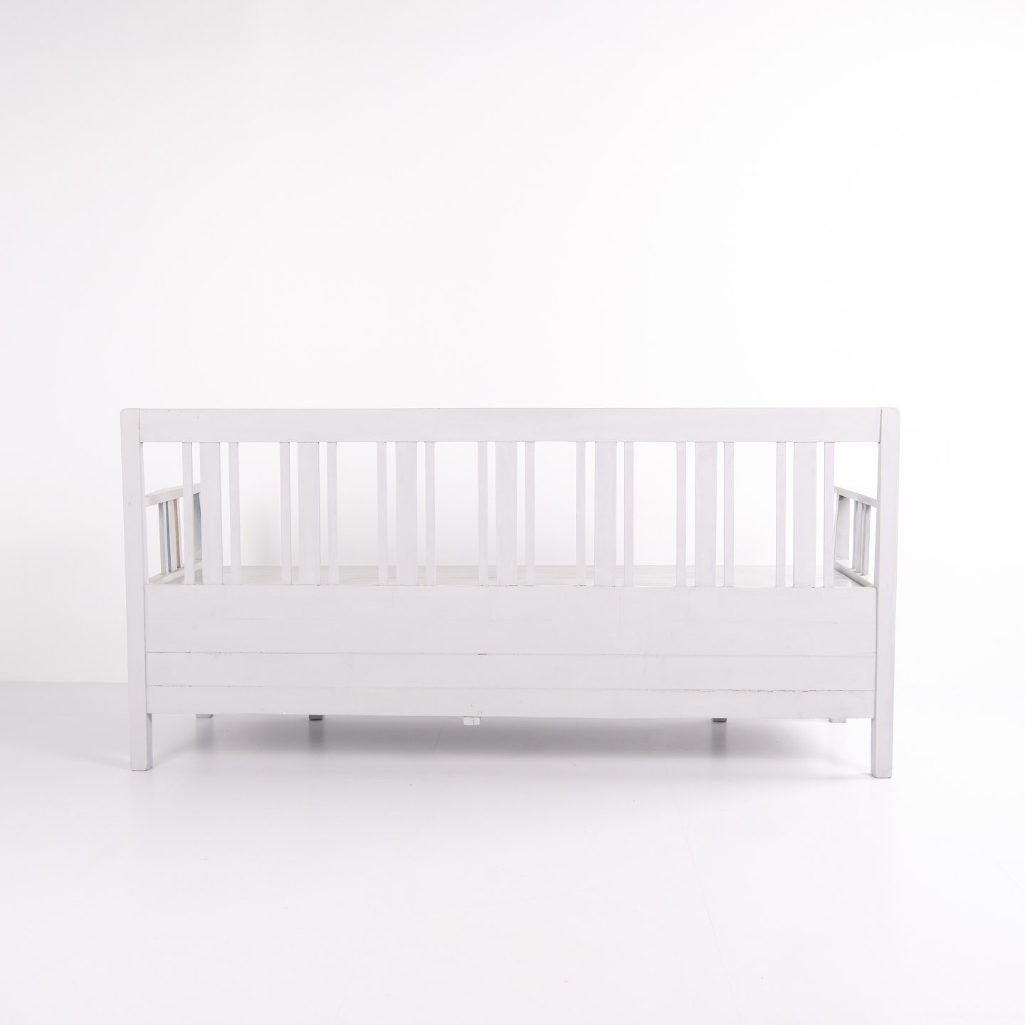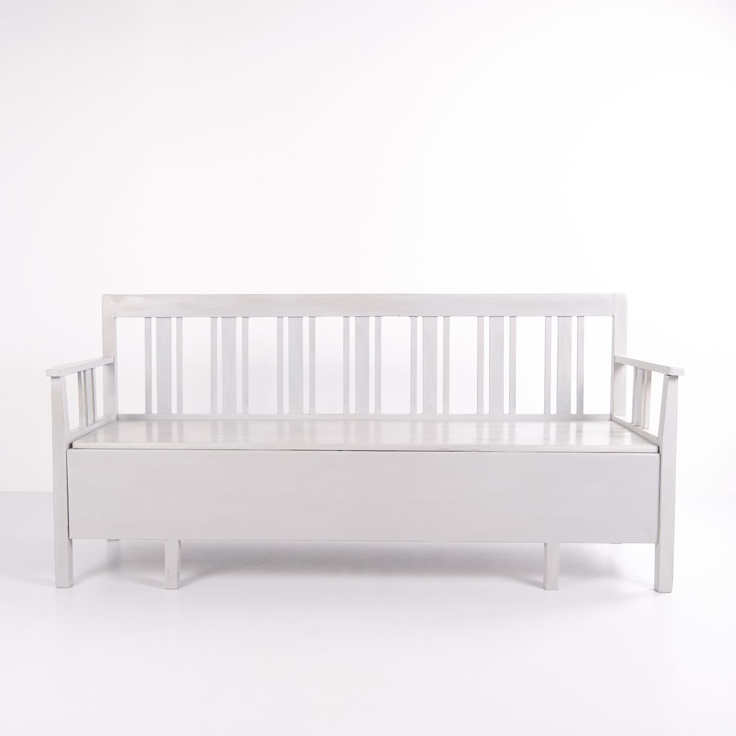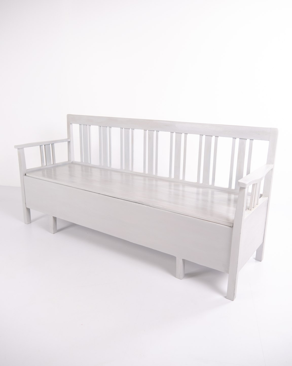 Swedish bench from the 1860s, made in pine and later painted in grey. A classic Scandinavian piece with decorative painted details and practical seating and storage function. Solid antique furniture with characteristic period features.