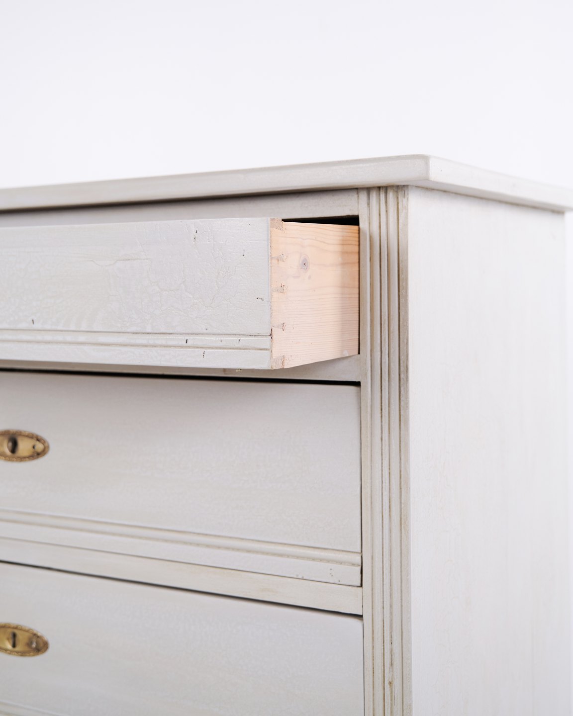 Antique chest of drawers from the 1890s with four drawers. Grey painted wood and classic design language with attractive patina.