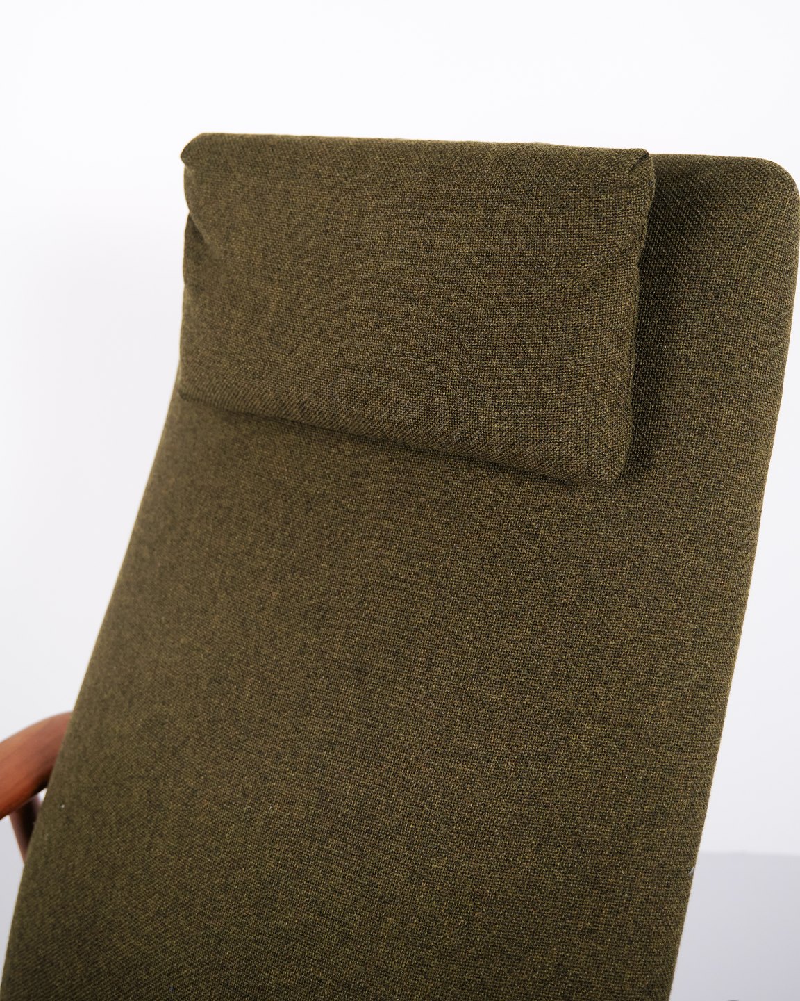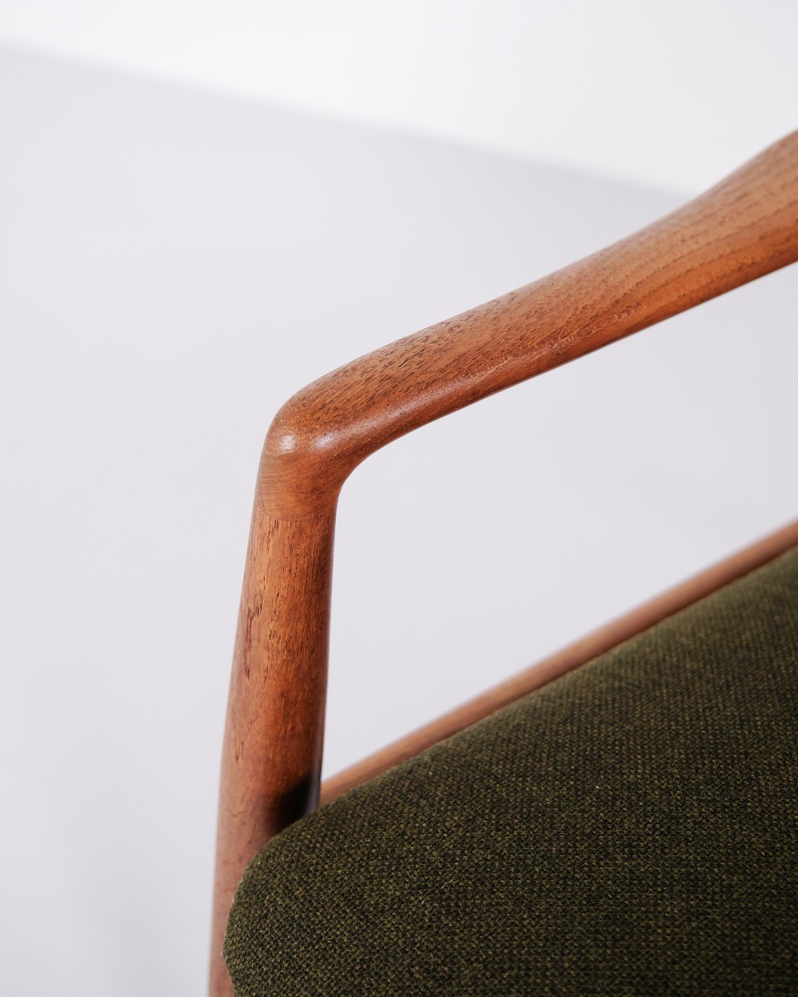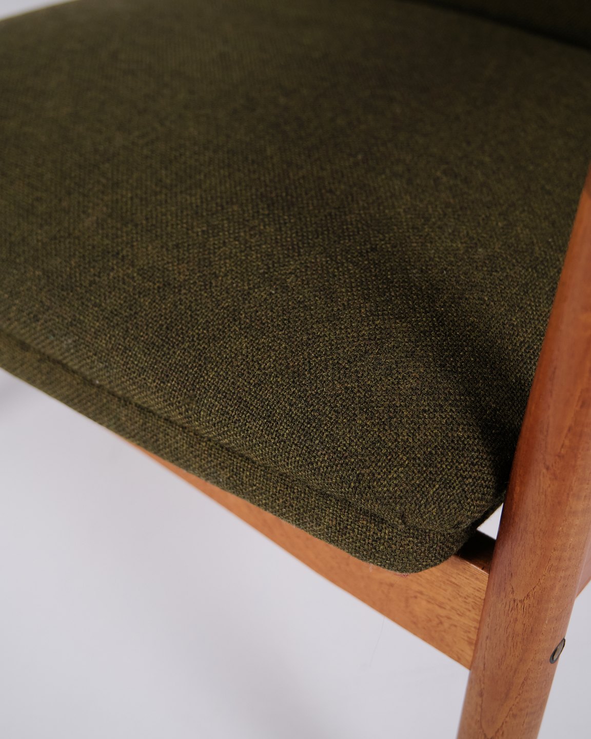 A pair of easy chairs with ottoman designed by Alf Svensson for Fritz Hansen. Teak and green fabric. Scandinavian design from the 1960s with a focus on comfort.
