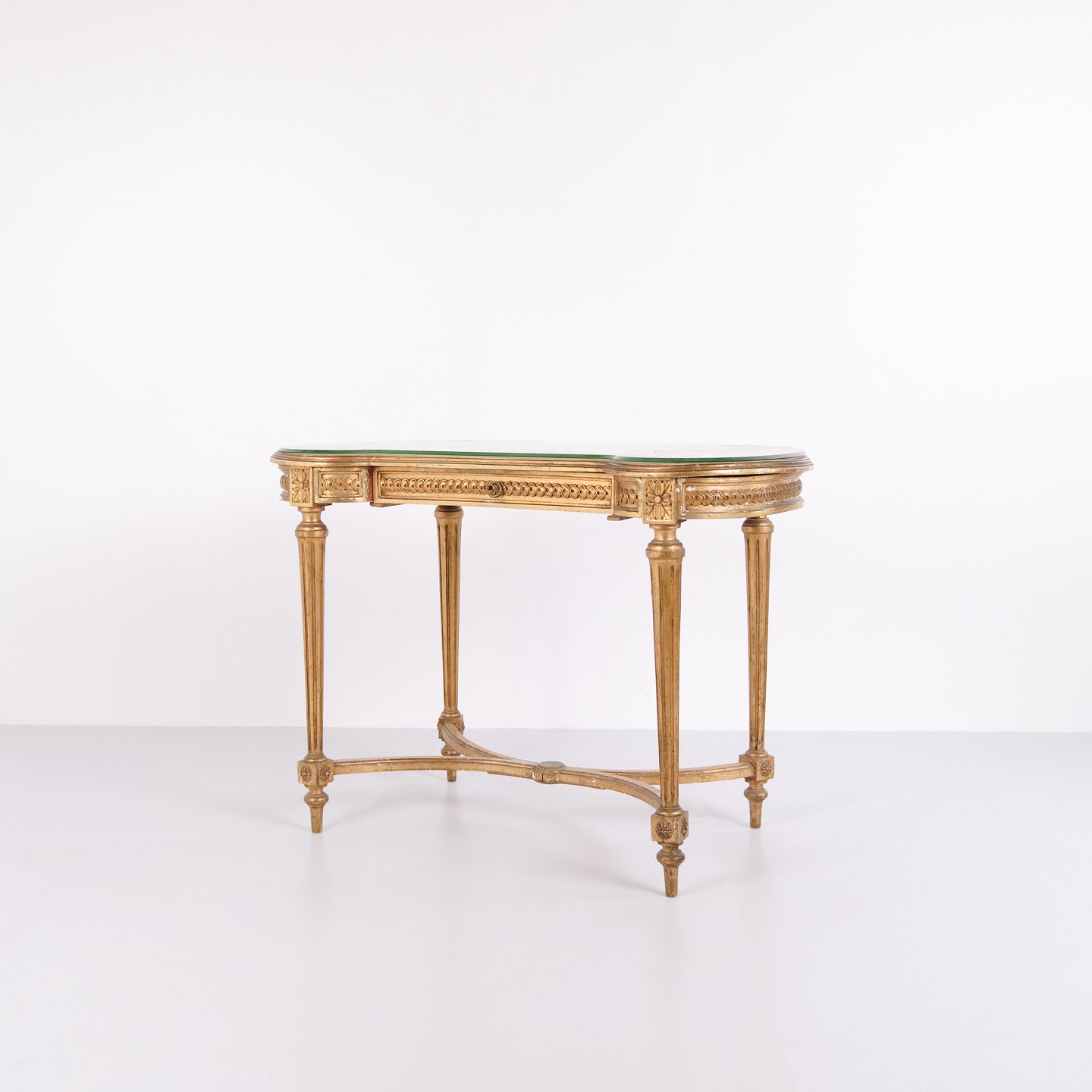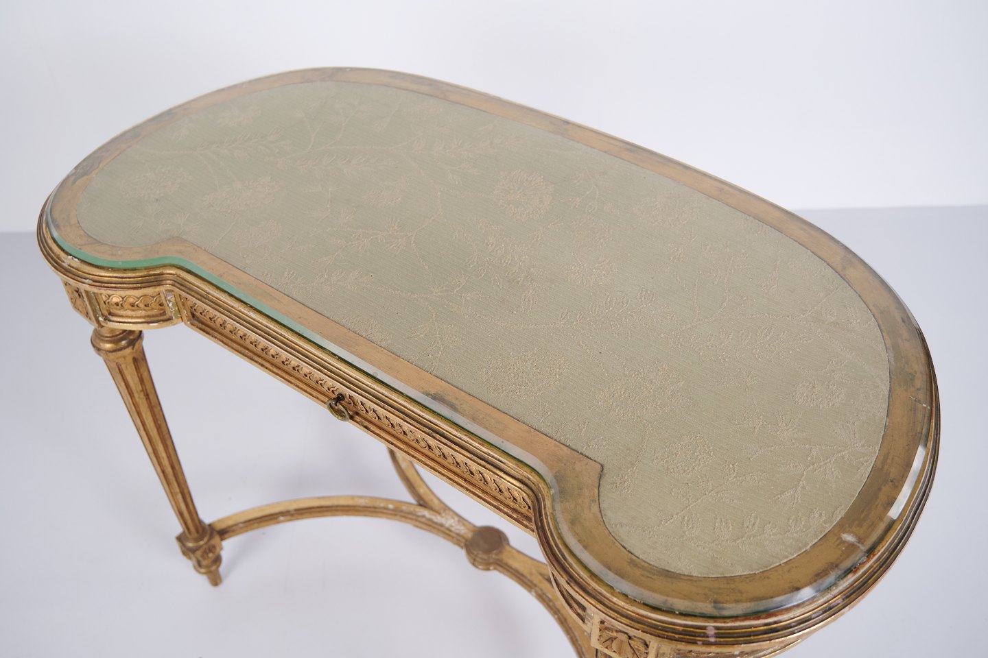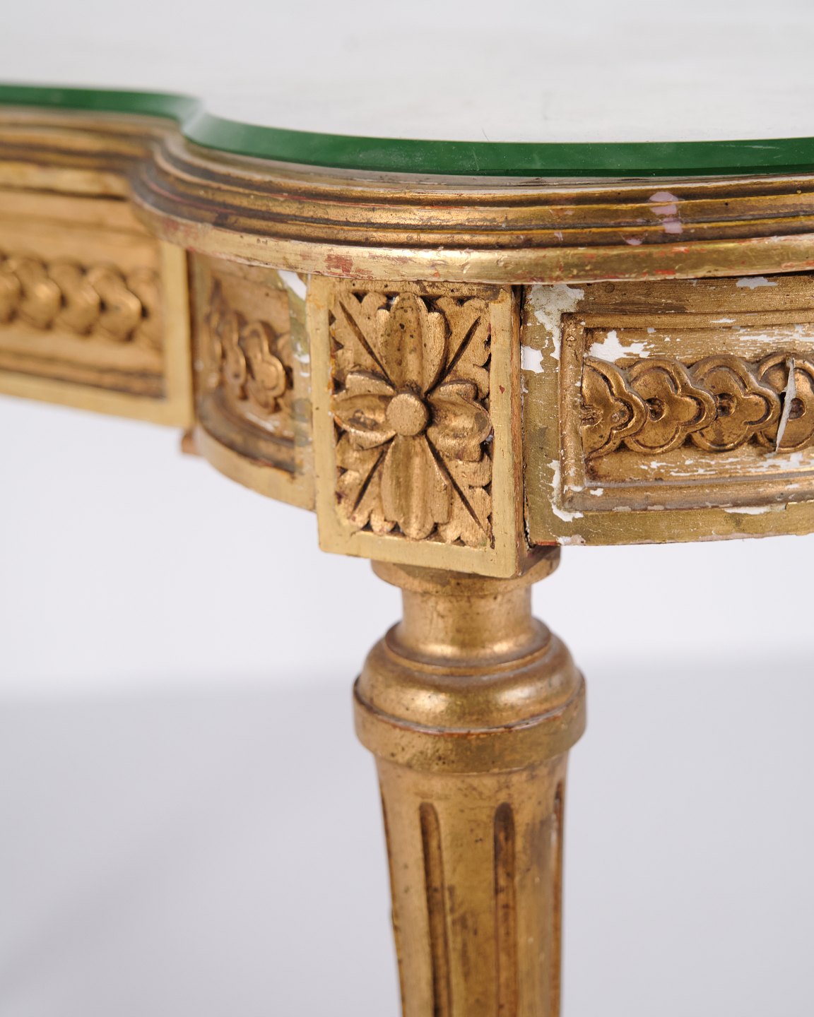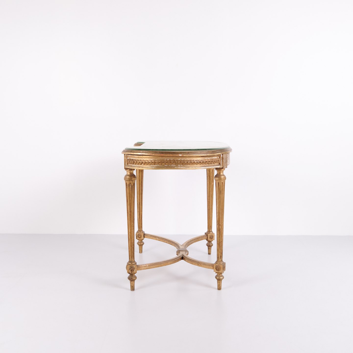 Please contact us for price informationAntique desk from the 1850s in Gustavian/Louis XVI style, gilded wood, glass top and drawer.