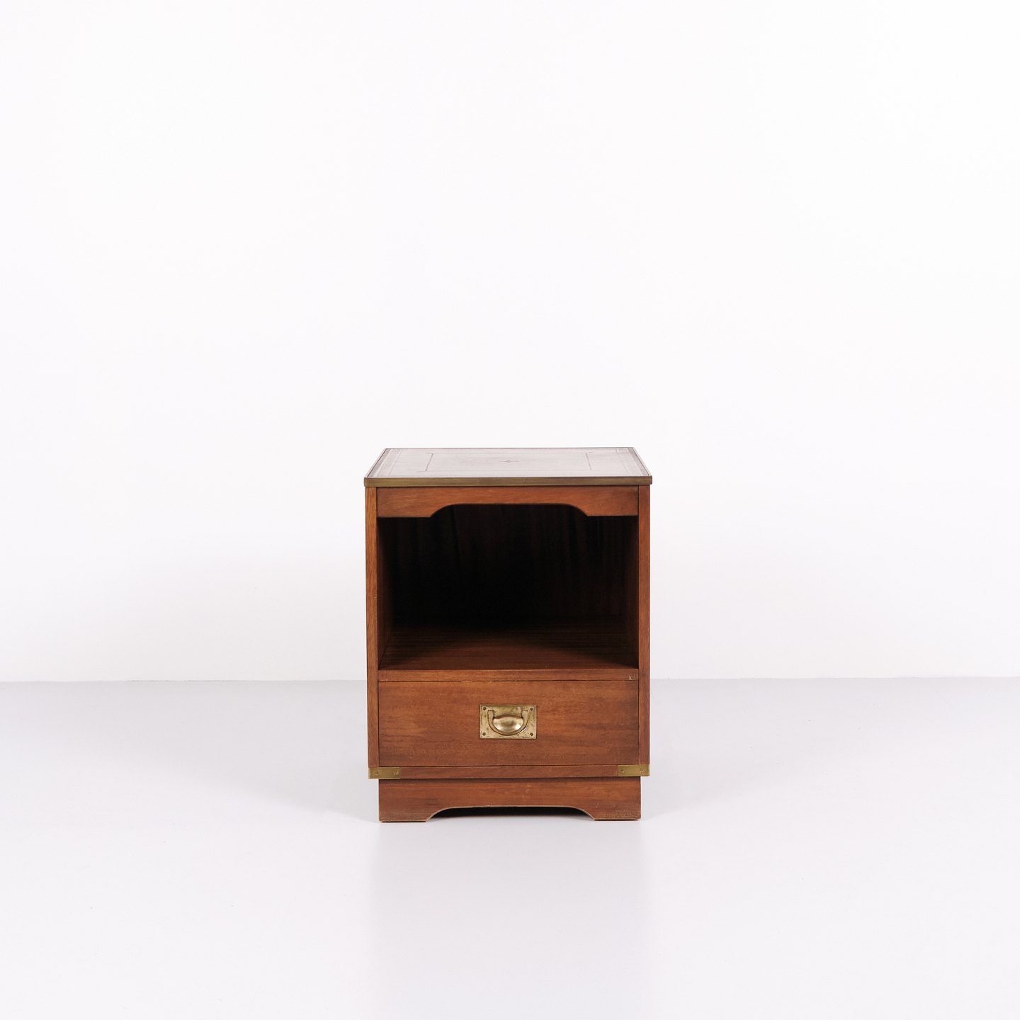 Pair of bedside tables in mahogany with leather top from Bevan Funnell. Military Campaign style from the 1960s with classic English design.