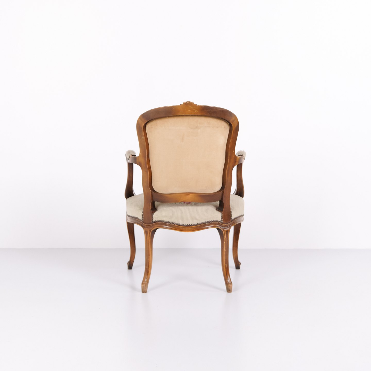 Neo-Rococo armchair from the 1930s with curved legs and floral fabric. Classic and decorative piece of furniture with a romantic expression.