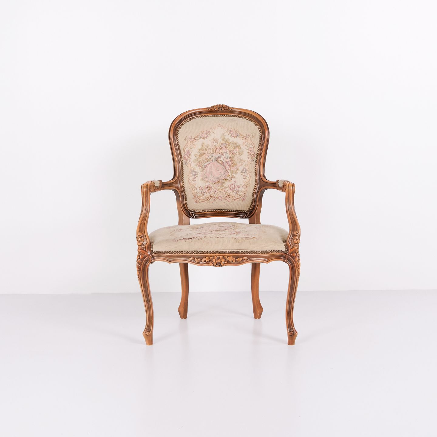 Neo-Rococo armchair from the 1930s with curved legs and patterned floral fabric. Classic and decorative piece of furniture in an elegant style.