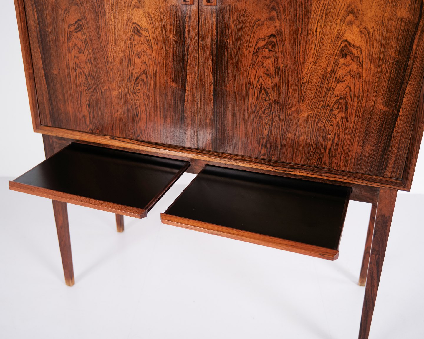 Der Schrank verfügt über praktische Aufbewahrungsmöglichkeiten, darunter ausziehbare Ablagen an der Vorderseite sowie eine verstellbare Einlegeplatte im Inneren. Das Möbel zeigt eine schöne Palisanderfurnieroberfläche und trägt den Stempel der Bornholm Møbelfabrik mit Modellnummer auf der Rückseite.
