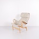 Pernilla armchair with matching footstool, model 69, designed by Bruno Mathsson and produced by DUX as a 35th anniversary edition. The chair is made of beech wood with light fabric upholstery and features a characteristic, ergonomic design that follows the natural curves of the body and ensures high comfort.