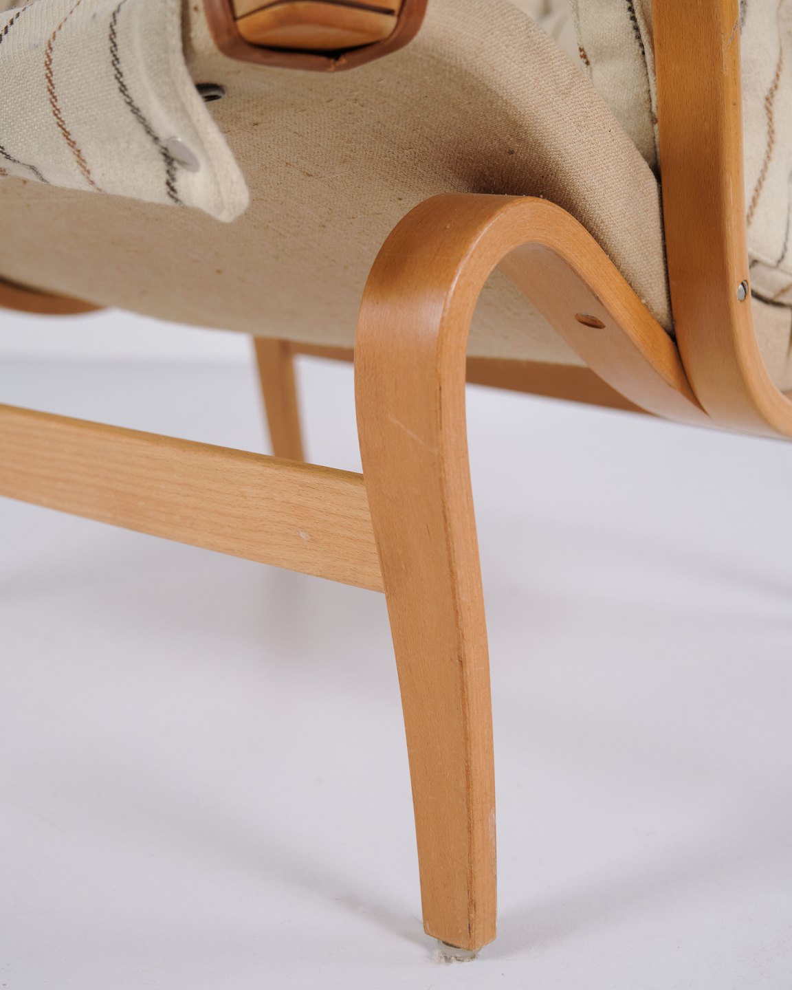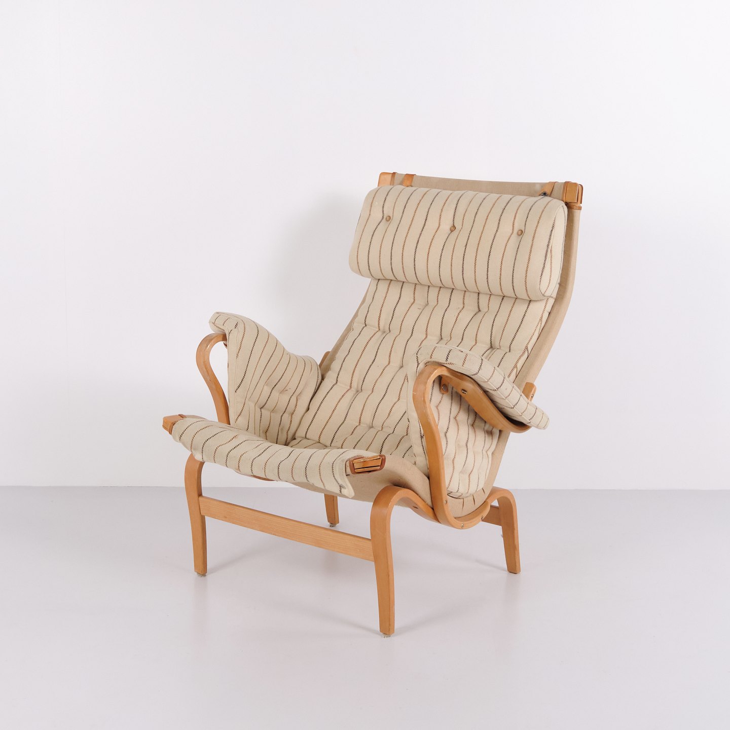 Bruno Mathsson Pernilla armchair model 69 from DUX in striped fabric and beech wood. Classic Scandinavian design from the 1960s.