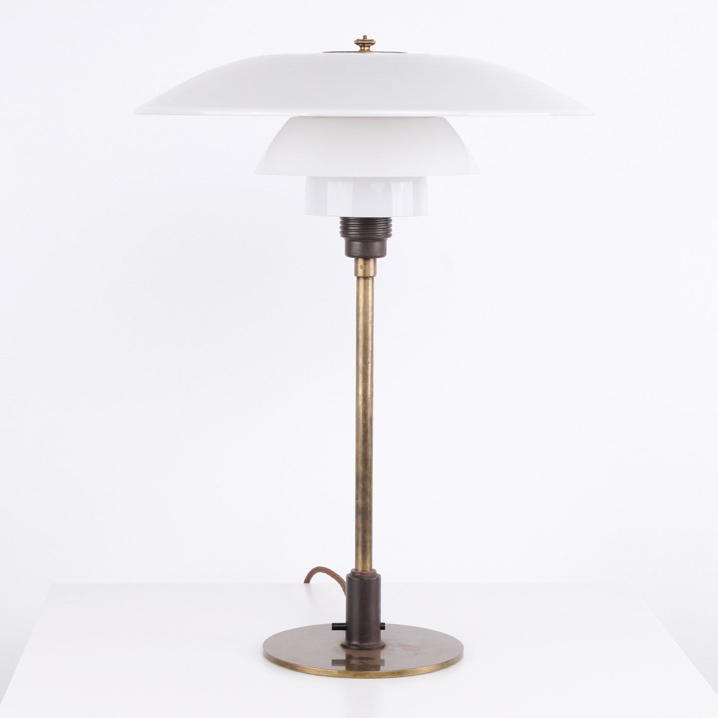 PH 4/3 table lamp in burnished brass with opal glass from Louis Poulsen, 1930s. Marked “Patented” and designed by Poul Henningsen.