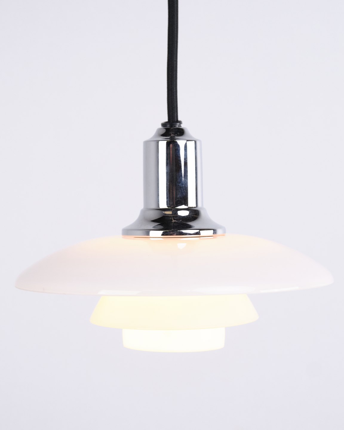 PH 2/1 pendant in chrome with opal glass from Louis Poulsen. Designed by Poul Henningsen with classic Danish lighting design and glare-free illumination.