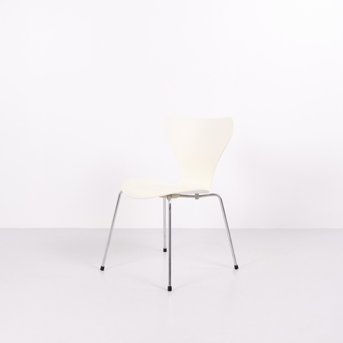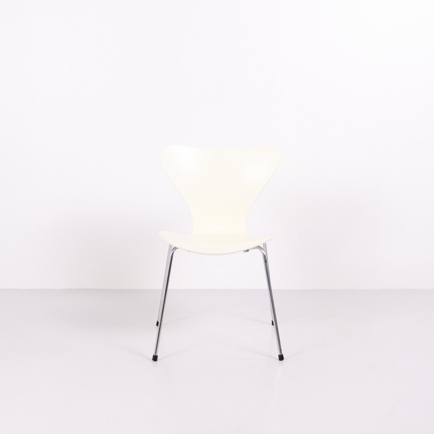Set of 6 Series 7 chairs model 3107 designed by Arne Jacobsen for Fritz Hansen. The model was introduced in 1955 as a further development of the Ant chair from 1952. Crafted in pressure-moulded veneer with white lacquered finish and chrome-plated tubular steel frame. The distinctive seven-shaped silhouette made the model one of the most produced chairs in Danish design history. Model 3107 has been used in private homes, restaurants, offices and public interiors worldwide and is still produced by Fritz Hansen. Sold only as a complete set.