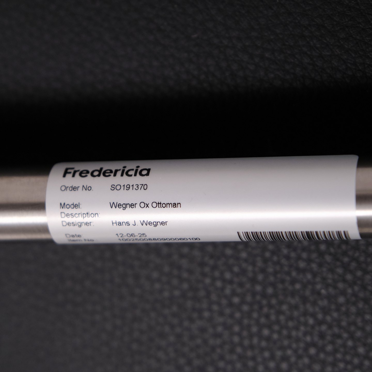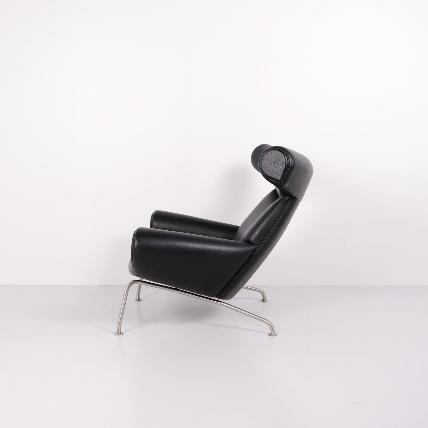 Ox Chair model EJ100 with matching ottoman designed by Hans J. Wegner. The model was designed in 1960 and is produced today by Fredericia Furniture following the acquisition of Erik Jørgensen. Upholstered in black leather with steel frame. The distinctive backrest with “horns” gave the chair its name Ox Chair. The design is considered one of Wegner’s most sculptural works and differs from many of his other chairs through its bold and organic form. The Ox Chair is represented in international collections and is among the most recognized Danish lounge chairs of the period.