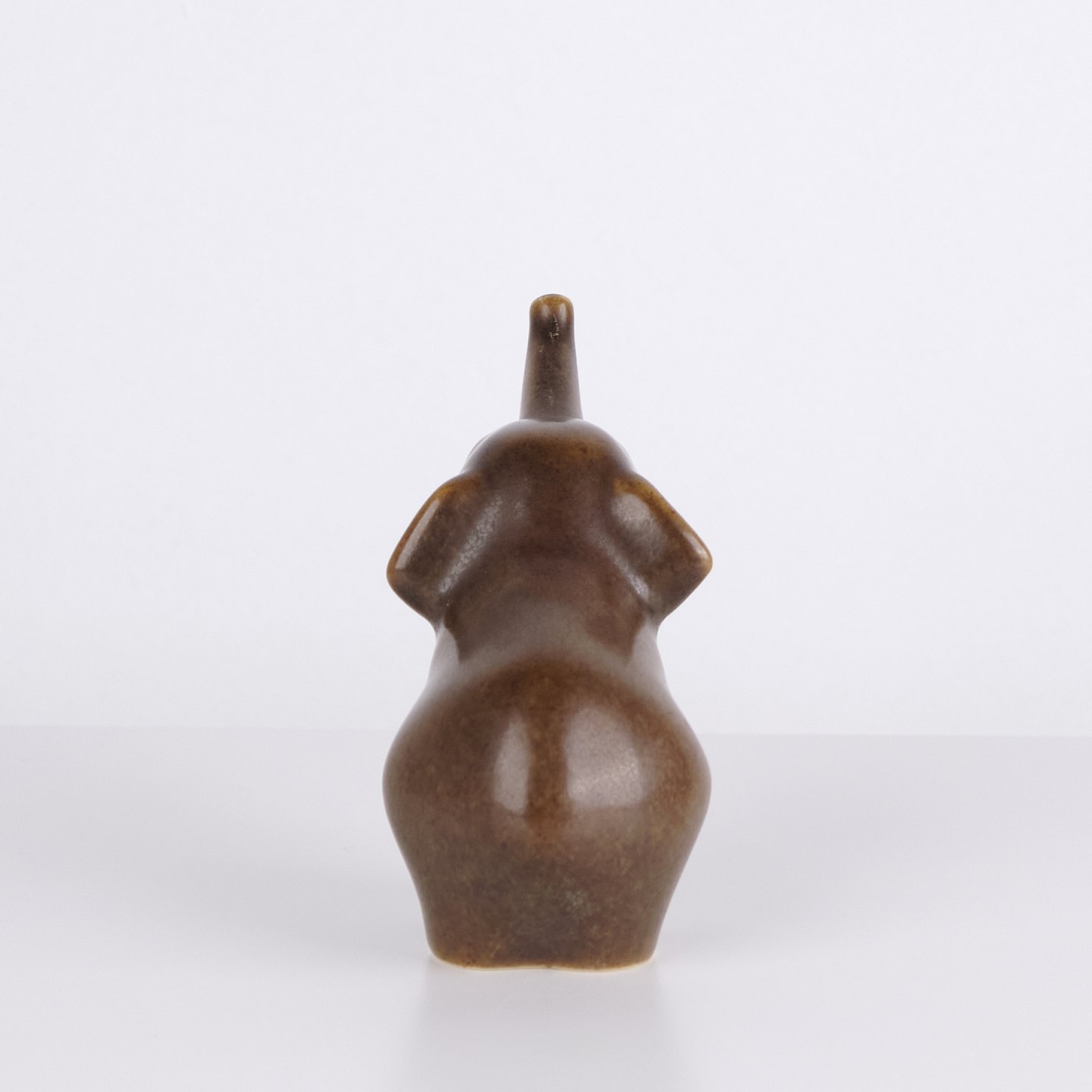 Elephant figure by Knud Basse made in brown glazed ceramic. The figure is modeled with raised trunk and rounded forms, creating a lively and decorative expression. A classic example of Danish animal ceramics, where simple lines and characterful motifs are central. Sought-after figure among collectors of Knud Basse and Danish ceramics.