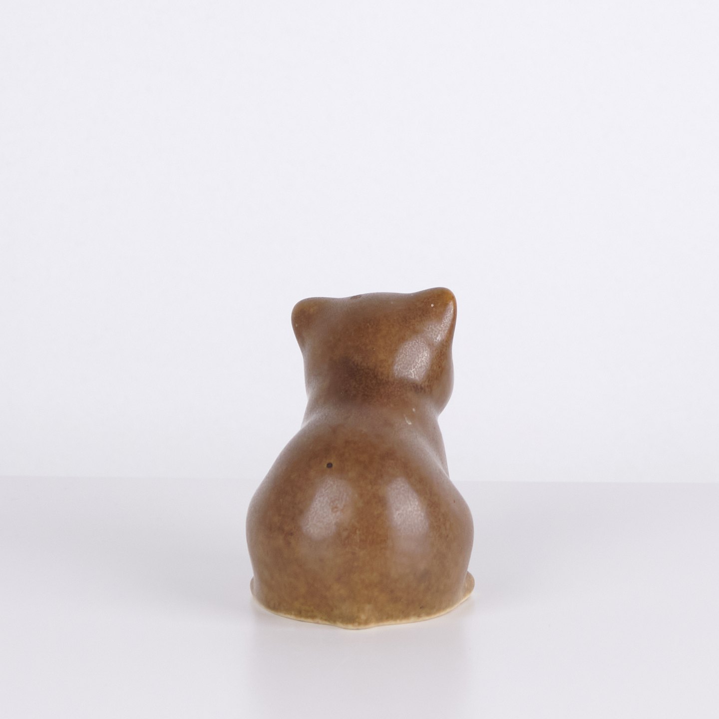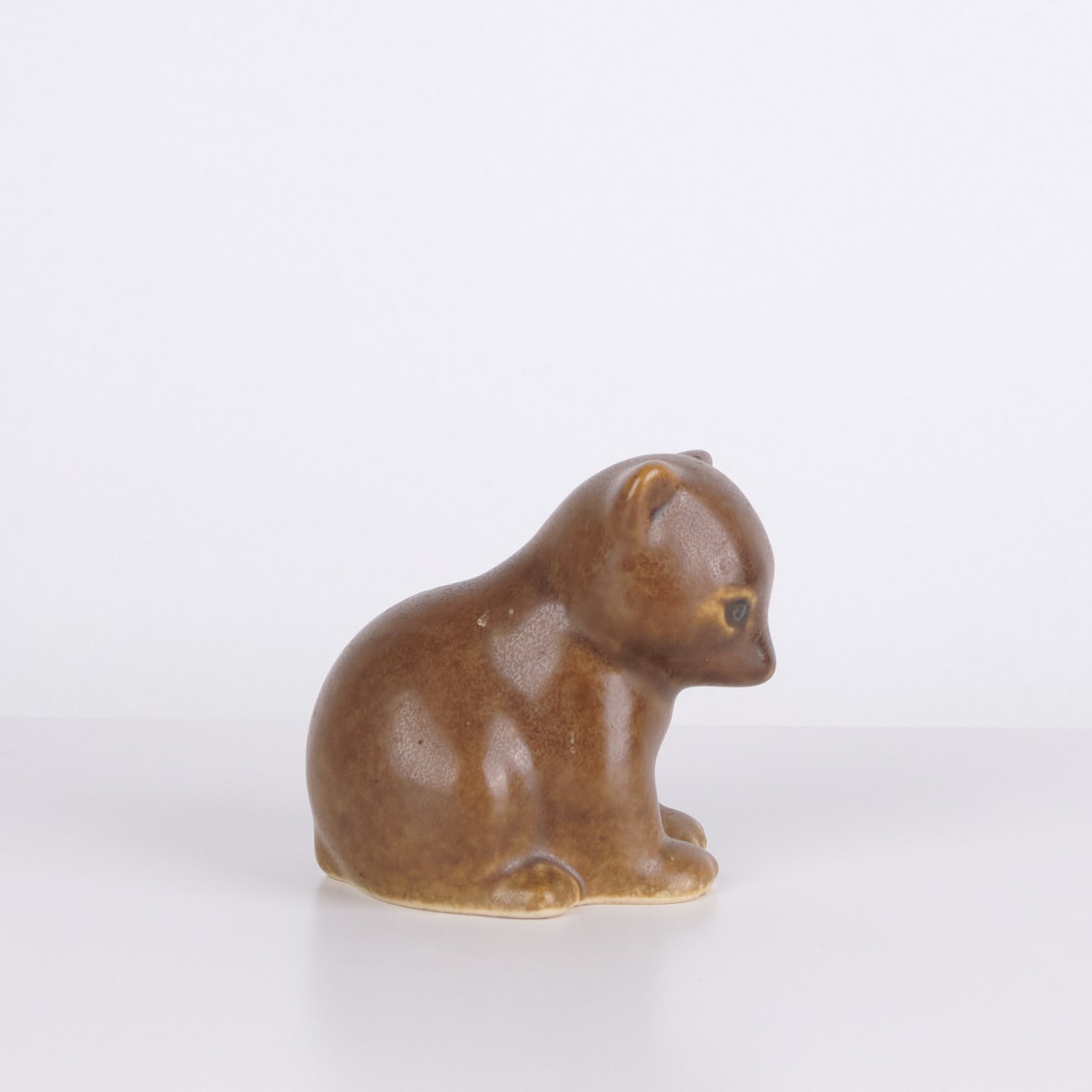 Bear figure by Knud Basse made in brown glazed ceramic. The figure shows a seated bear with lowered head, defined paws and soft forms. A smaller model from Knud Basse’s series of animal figures, produced in Denmark in the 1960s.