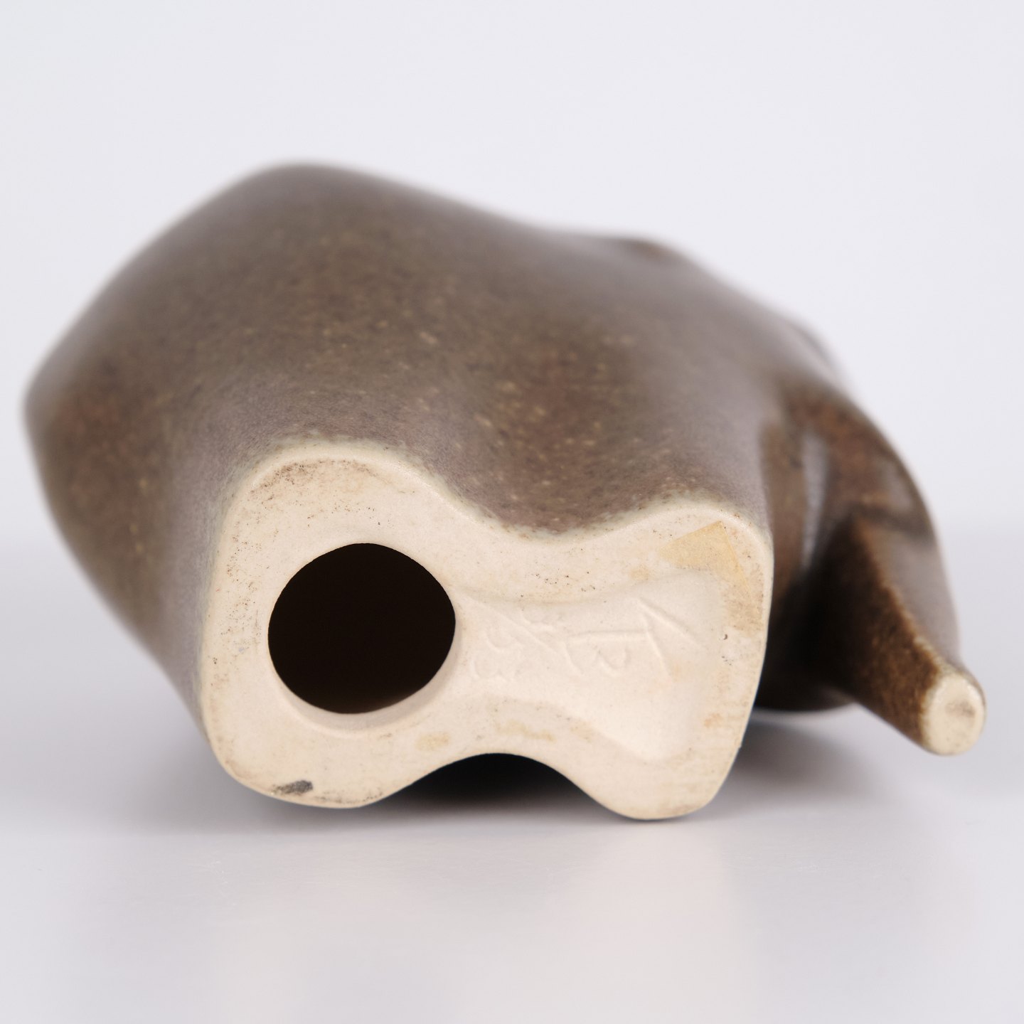 Elephant figure by Knud Basse made in brown glazed ceramic. The figure is modeled in a simple compact form with downward curved trunk and rounded sides. Minimalist model from Knud Basse’s series of animal figures, produced in Denmark in the 1960s.