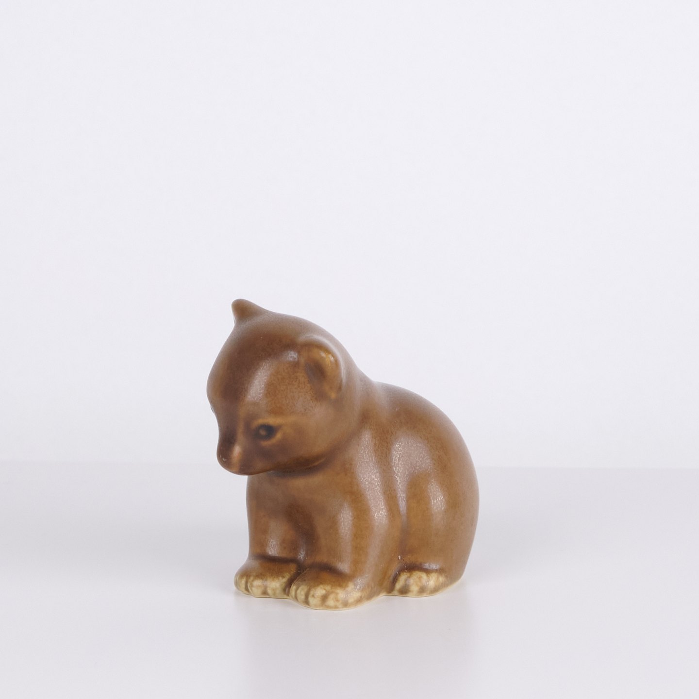 Bear figure by Knud Basse made in light brown glazed ceramic. The figure shows a seated bear with lowered head, defined paws and soft organic forms. A classic smaller model from Knud Basse’s series of animal figures produced in Denmark in the 1960s.