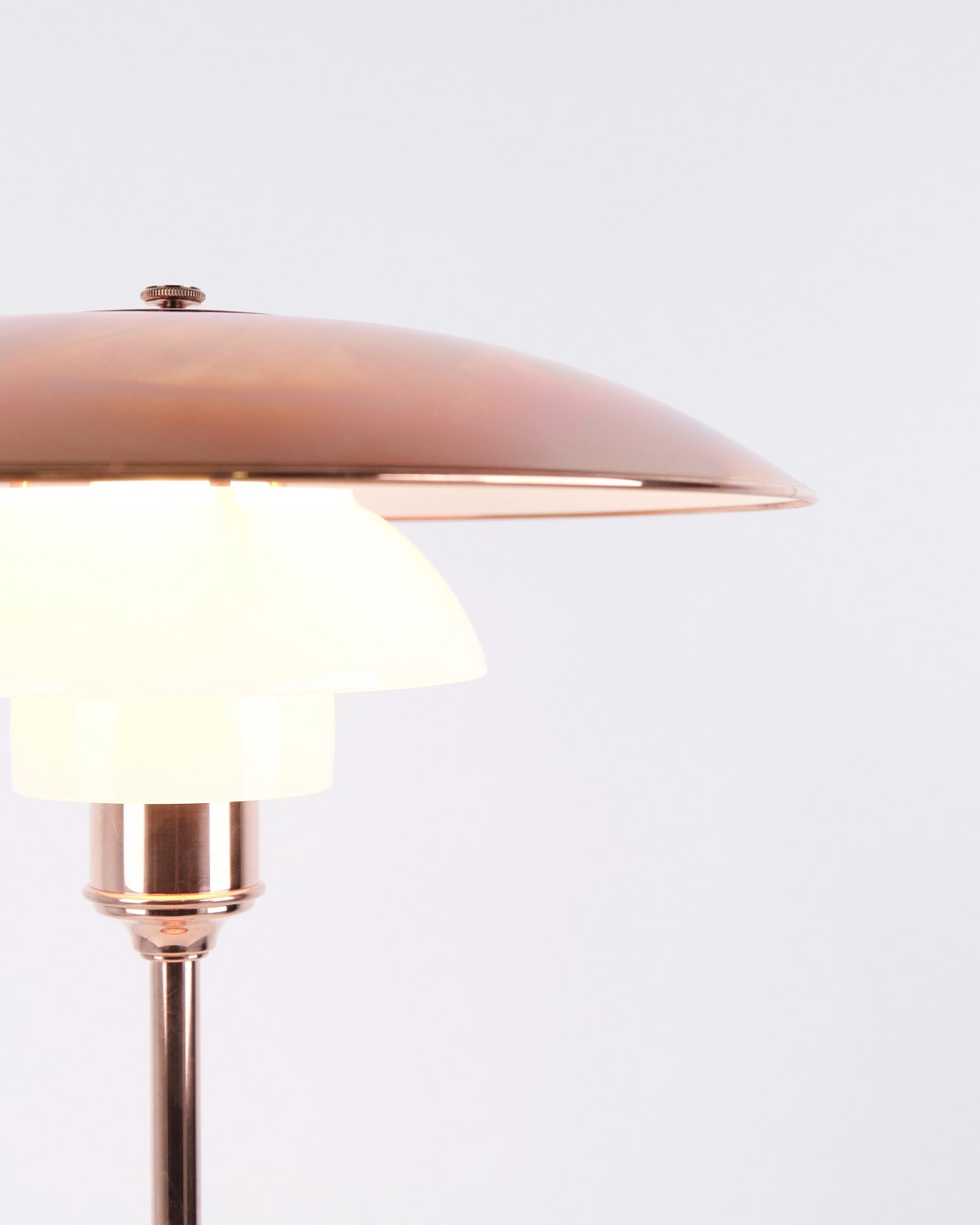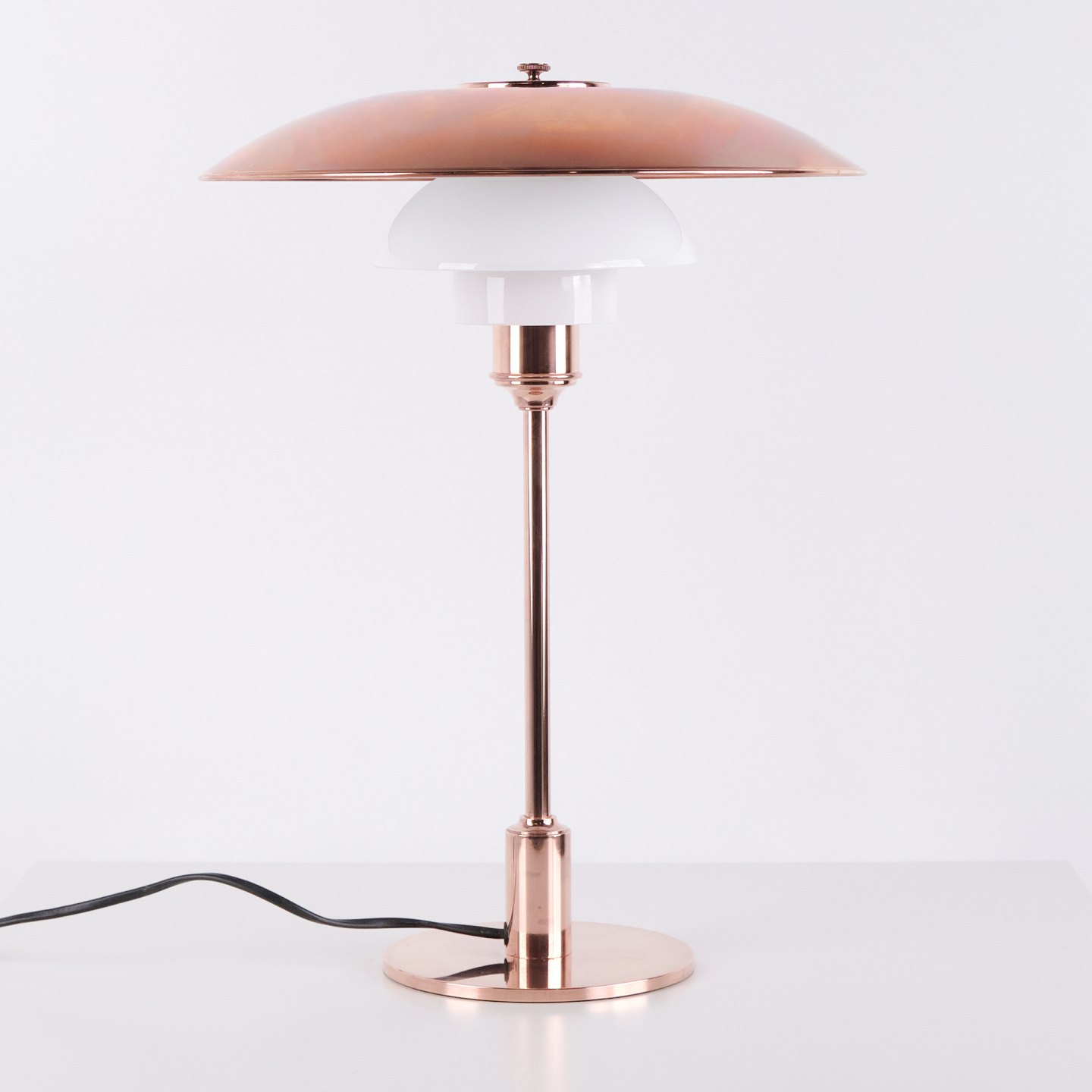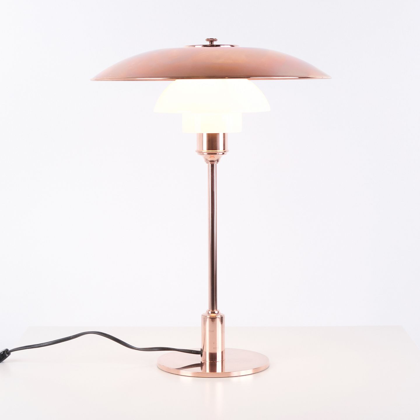 PH table lamp model PH 3½-2½ Limited Edition designed by Poul Henningsen and manufactured by Louis Poulsen. The lamp is made of copper with top shade in copper and two lower shades in white opal glass. This version includes the copper top shade only. The model was produced and sold for a limited period in 2015, making it particularly sought after among collectors of PH lamps and Danish lighting design.