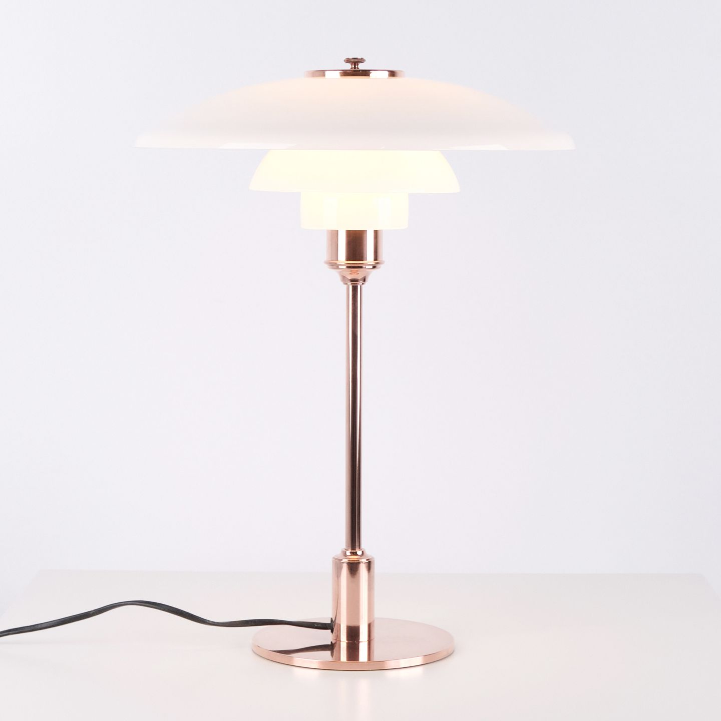 PH table lamp model PH 3½-2½ Limited Edition designed by Poul Henningsen and manufactured by Louis Poulsen. The lamp is made of copper with top shade in white opal glass and two lower shades in white opal glass. The model was sold for a limited period in 2015.