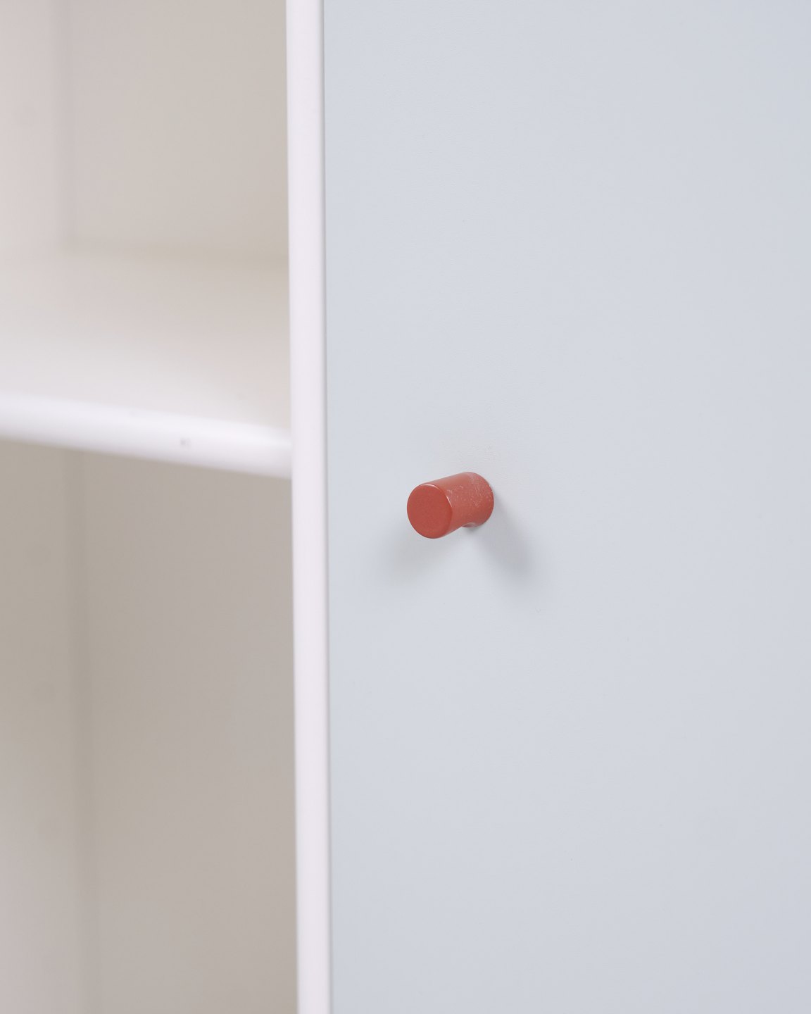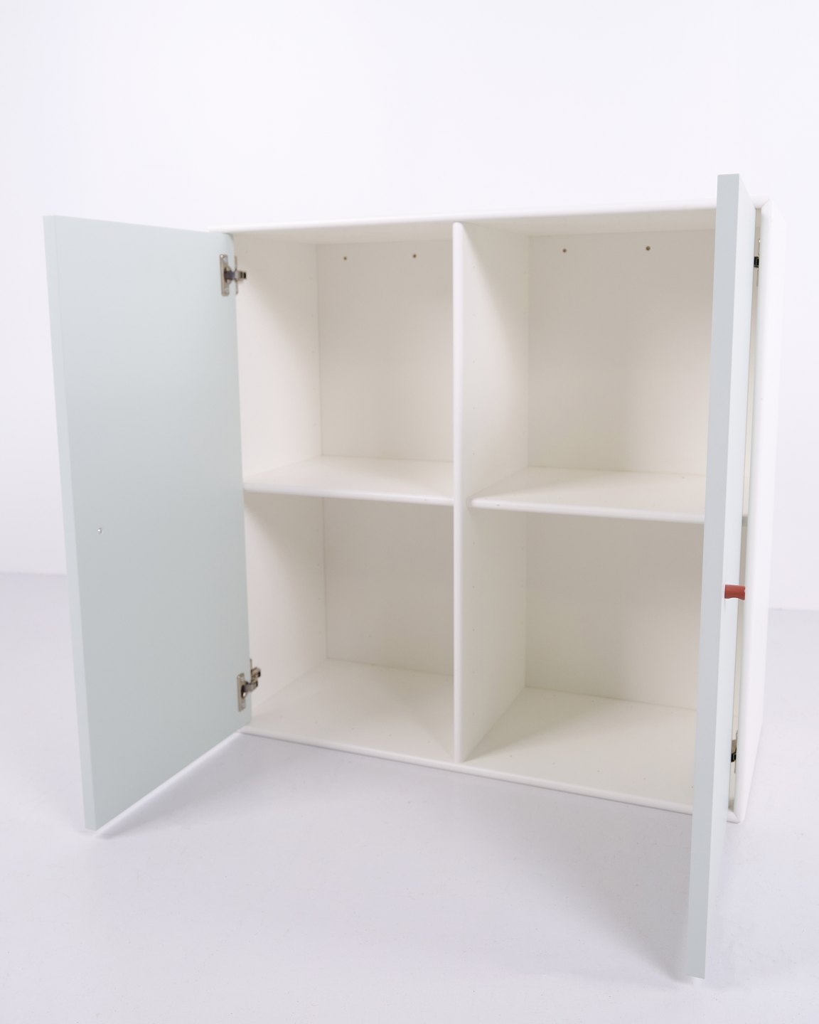 Montana cabinet module from the Montana System designed by Peter J. Lassen for Montana. Made of lacquered MDF with white корпус, two mint green doors and brown handles. Suitable as a wall cabinet, hallway unit or storage module. 2 pieces in stock.
